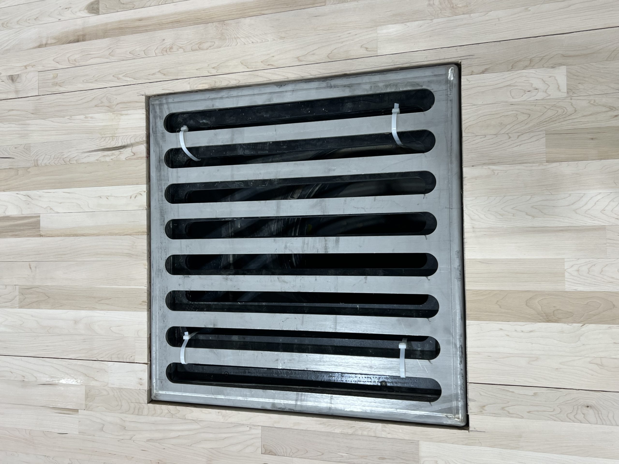 Engineers addressed this issue by introducing air beneath the turf, allowing it to move with minimal resistance. The system uses seven high-volume fans, each rated at 11,200 CFM, connected to an underground duct network. These ducts deliver air to 28 distribution points across the gym floor. As the turf is deployed, the fans activate in sequence, injecting controlled airflow beneath the surface so the turf effectively “floats” across the floor, similar to a large-scale air hockey table.